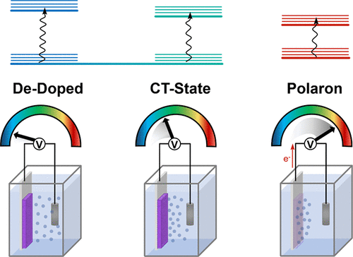 The above schematic illustrates a conjugated polymer film in an electrochemical cell. The film is imbibed with a variety of charged species – both electronic and ionic. The increasing applied potential (shown as a voltage dial) triggers a redox process that changes the charge density in the polymer. The authors investigate the changes occurring in the polymer throughout the redox process using sophisticated optical technique involving two lasers – one that is a single energy to excite the sample (green
